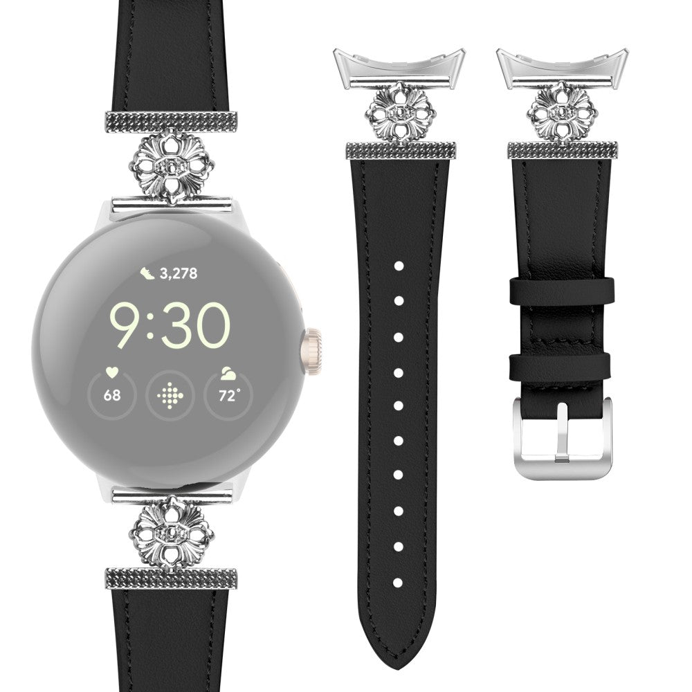 Google Pixel Watch Genuine Cow Leather Band Flower Decor Adjustable Strap - Black