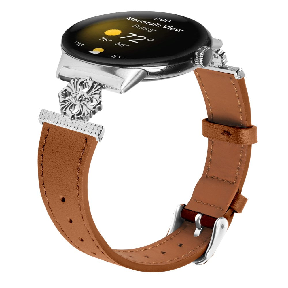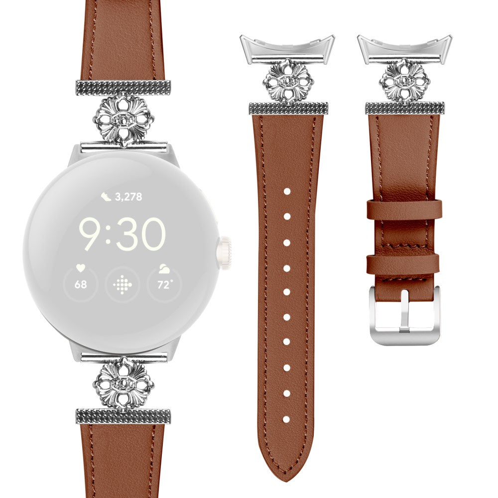 Google Pixel Watch Genuine Cow Leather Band Flower Decor Adjustable Strap - Brown