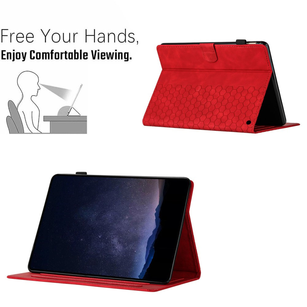 Crafted from high-quality vegan leather, this tablet case seamlessly blends aesthetics with functionality, offering exceptional protection through its flexible inner case. The unique honeycomb pattern not only enhances its visual appeal but also adds character to your device. Designed with your convenience in mind, the adjustable viewing stand features dual stripes that allow for multiple comfortable angles tailored for both viewing and typing.A secure dual-sided magnetic clasp ensures that your case remains closed, safeguarding your device and essentials. Inside, the thoughtfully designed card holder includes three slots for your main cards, along with a dedicated photo slot, so you can keep everything you need at your fingertips. An elastic loop on the side provides a practical solution for carrying your stylus pen, ensuring it’s always within reach. Additionally, built-in magnets support an auto sleep/wake function, which effectively conserves battery power. This tablet case effortlessly combines protection, style, and practicality, making it an essential accessory for any modern lifestyle.