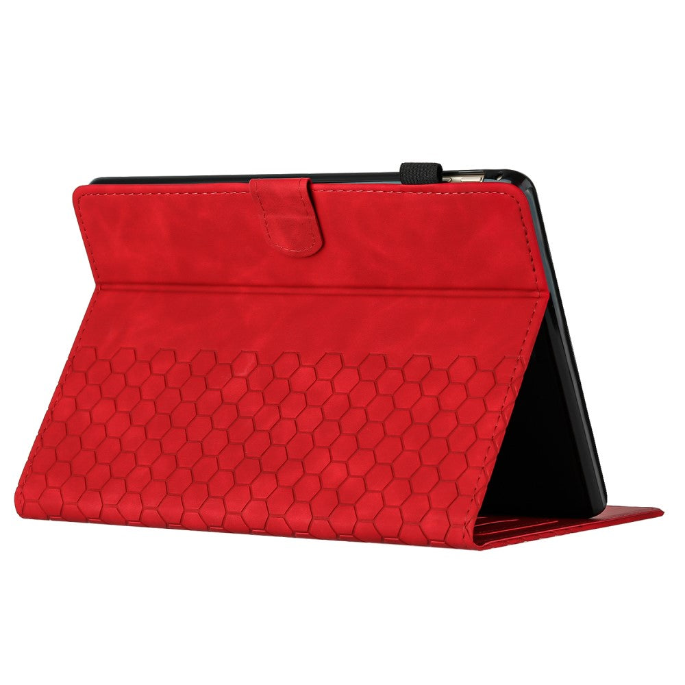 Crafted from premium vegan leather, this tablet case seamlessly blends style and function. The eye-catching honeycomb pattern adds a contemporary flair, ensuring your device stands out in any setting. Inside, a flexible inner case provides robust protection against daily wear and tear, giving you peace of mind as you go about your day.Equipped with an adjustable viewing stand and two sturdy stripes, this case offers multiple comfortable angles for both watching videos and typing. The dual-sided magnetic clasp ensures your tablet and essentials remain secure, while the built-in card holder features three slots for your cards and an additional pocket for your favorite photo, keeping everything within easy reach. For those who utilize a stylus, the designated elastic loop provides a convenient storage solution (stylus not included). The smart auto sleep/wake functionality is powered by built-in magnets, helping to conserve battery life. Experience the perfect combination of durability, practicality, and elegance with this thoughtfully designed tablet case.
