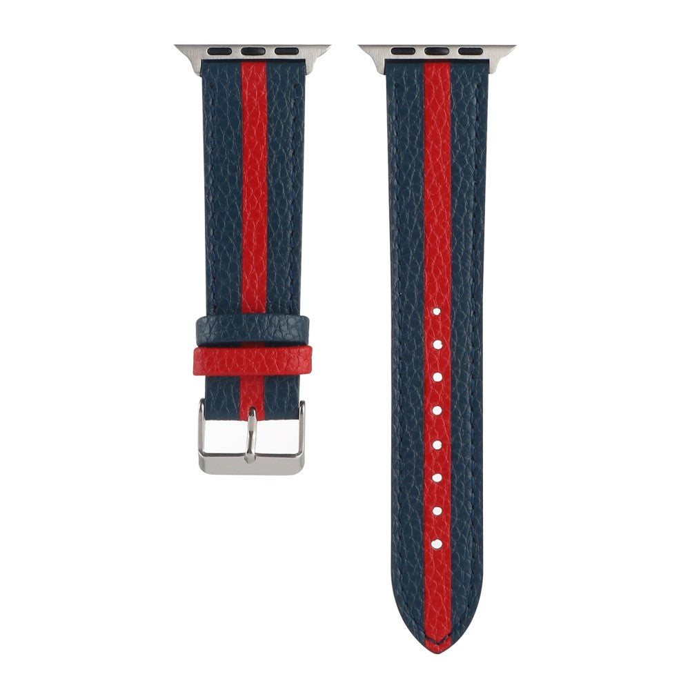 For Apple Watch Ultra 49mm / Series 8 / 7 45mm / 6 / 5 / 4 / SE / SE (2022) 44mm / 3 / 2 / 1 42mm Watch Strap Genuine Leather Stripe Watch Band - Blue / Red