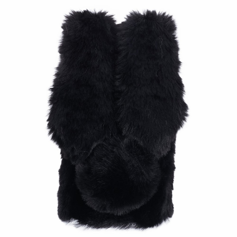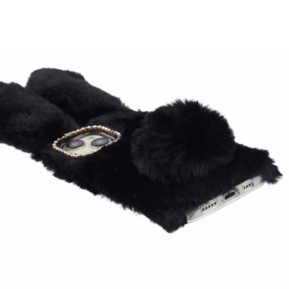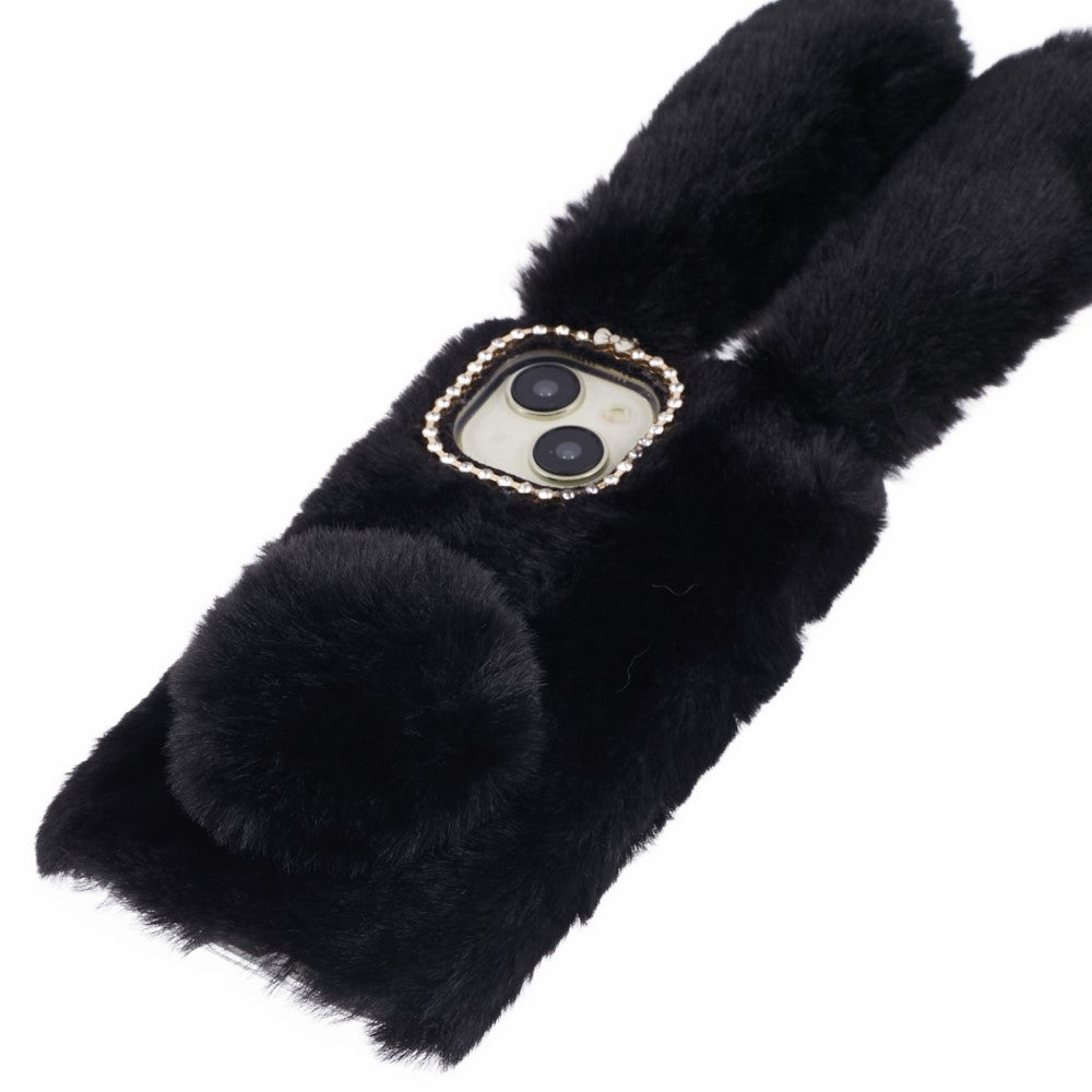 Fluffy rabbit style iPhone 15 Plus cover. Super cute, fur coated Bunny cover with big bunny ears and a tail that doubles as a kick stand.