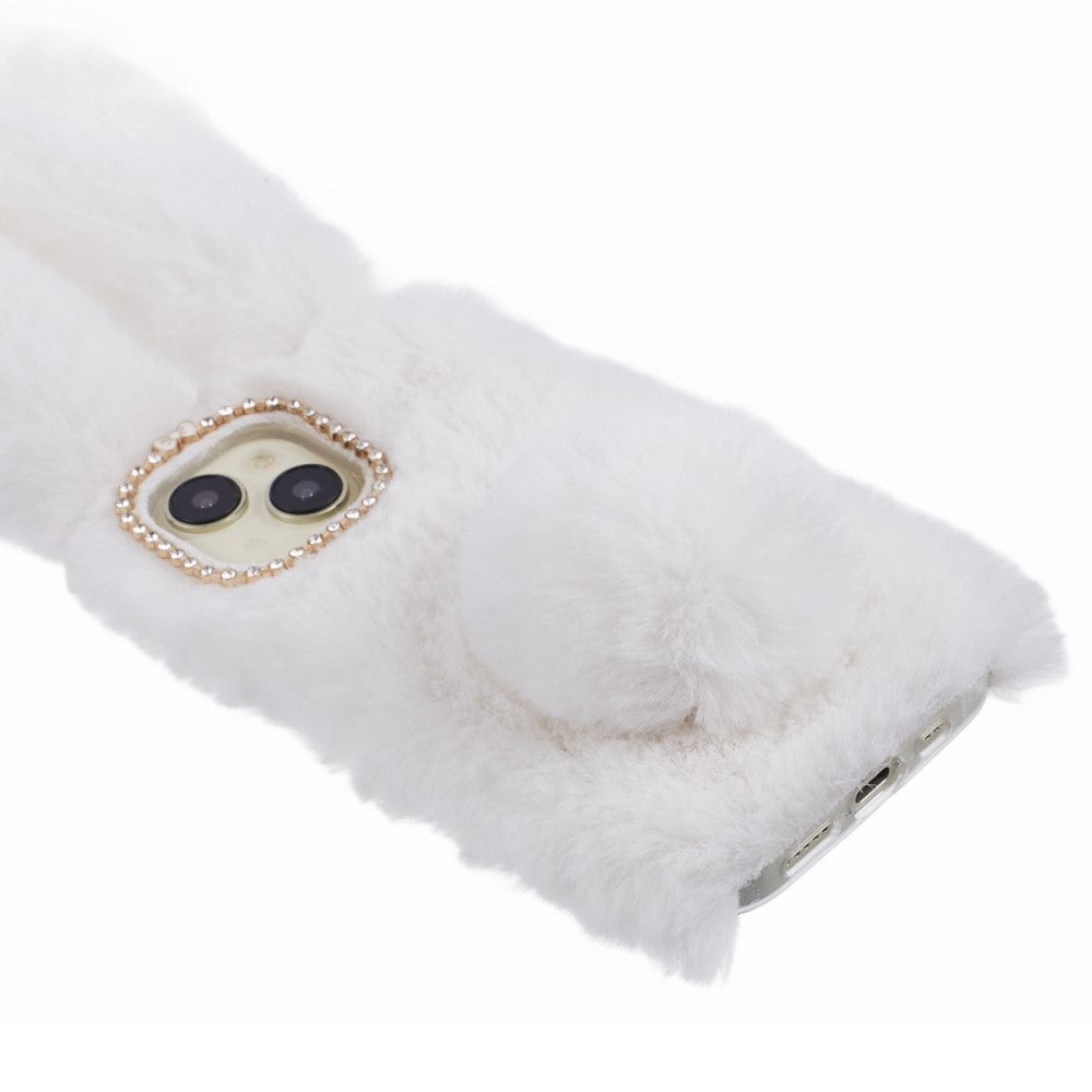 Fluffy rabbit style iPhone 15 Plus cover. Super cute, fur coated Bunny cover with big bunny ears and a tail that doubles as a kick stand.