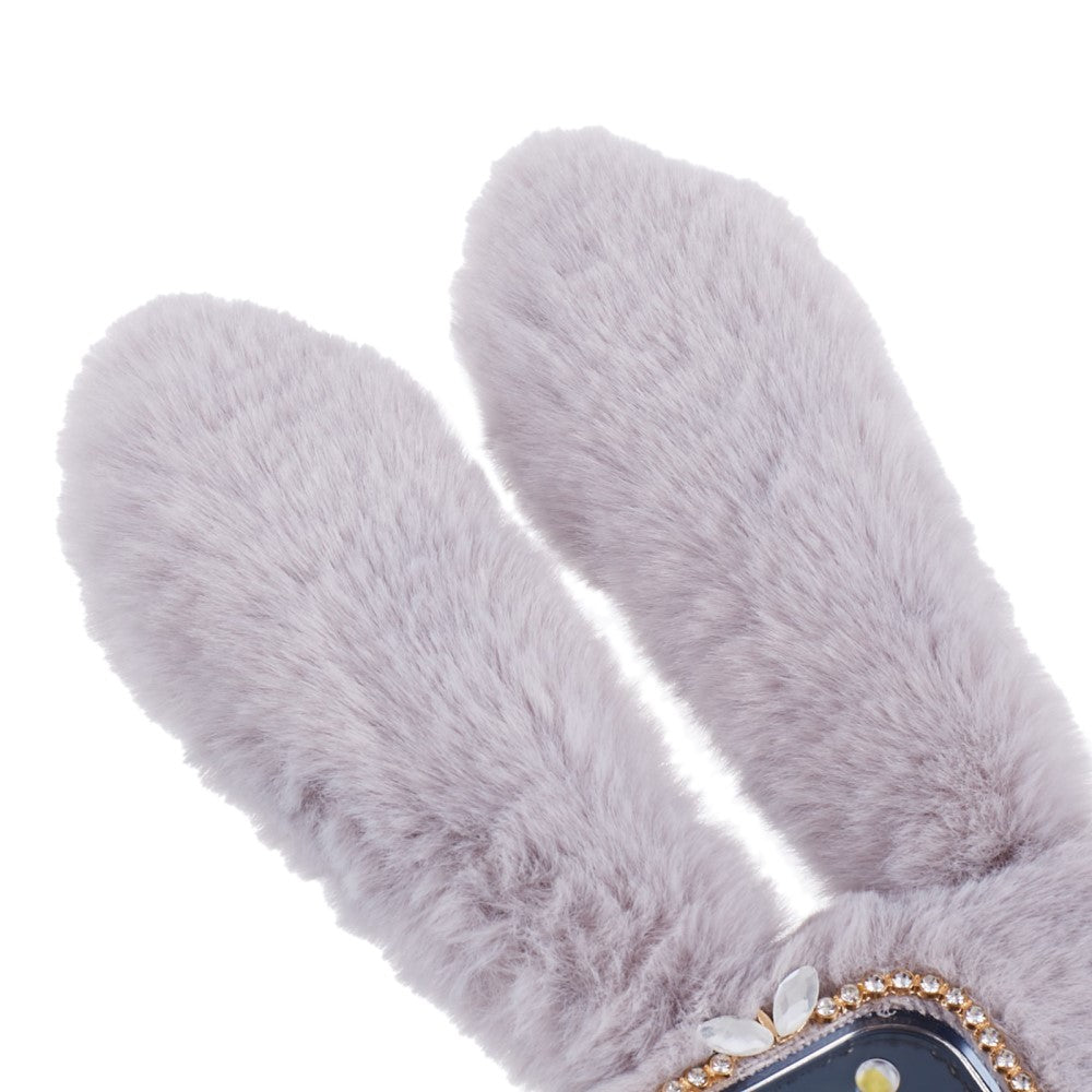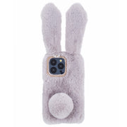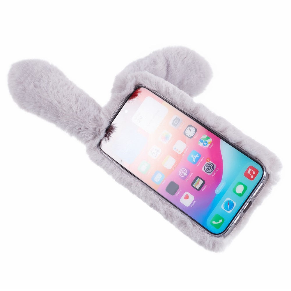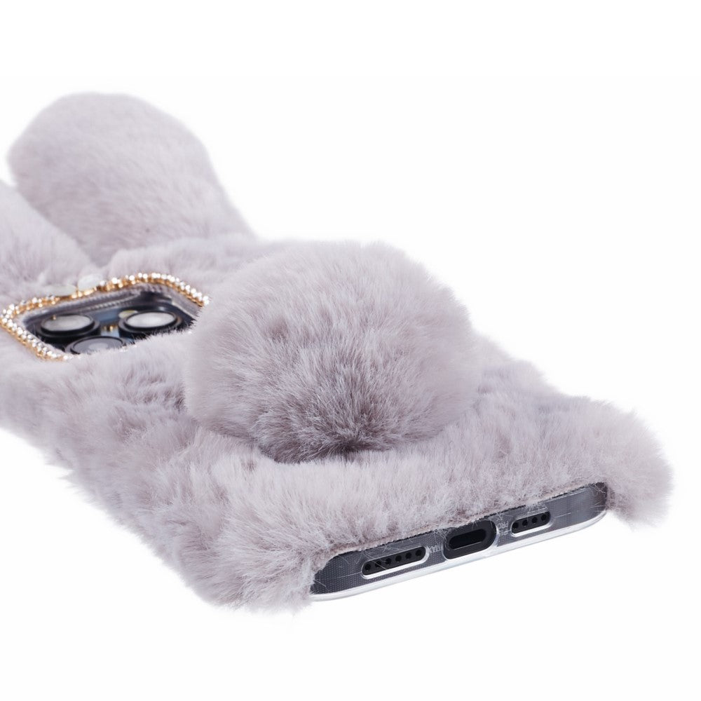 Fluffy rabbit style iPhone 15 Pro cover. Super cute, fur coated Bunny cover with big bunny ears and a tail that doubles as a kick stand.