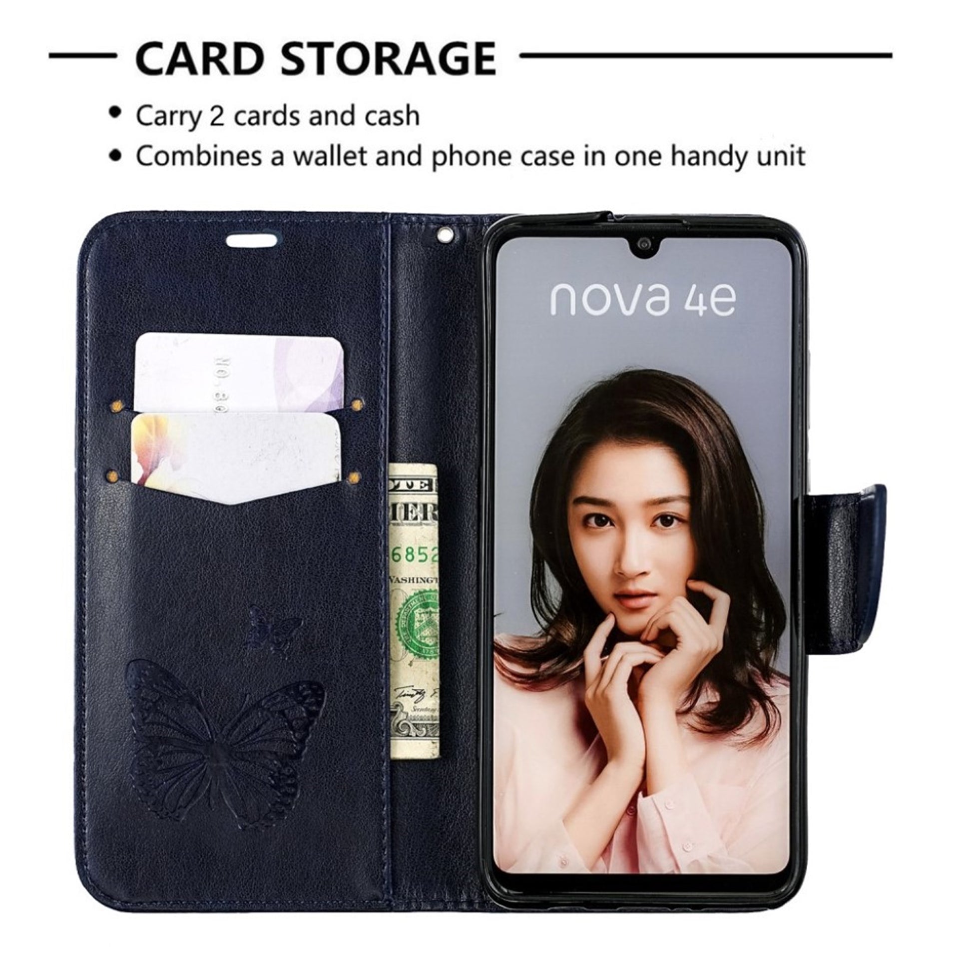 Fashionable leather case with beautiful butterfly imprint. This case for Huawei P30 Lite has a couple of card slots and a larger pocket. It comes with a handy strap and supports hands-free viewing. Made from PU leather this simple flip case provides excellent protection and a stylish look for your Huawei P30 Lite.
