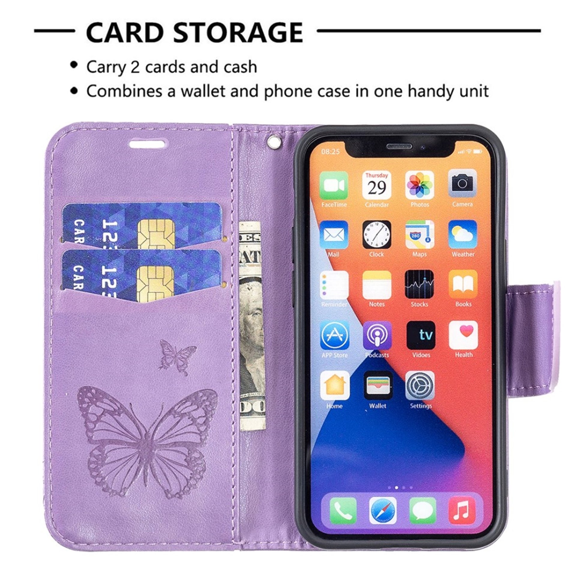 Fashionable leather case with beautiful butterfly imprint. This case for iPhone 13 has a couple of card slots and a larger pocket. It comes with a handy strap and supports hands-free viewing. Made from PU leather this simple flip case provides excellent protection and a stylish look for your iPhone 13.