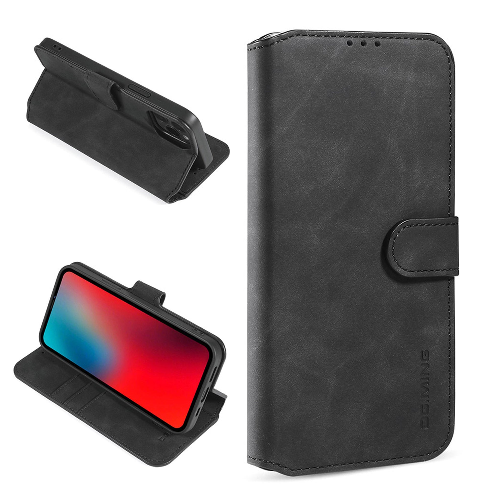 Retro wallet-style leather case for iPhone 13 Pro. The DG.MING Retro case is made from vintage looking PU leather and features three card slots. It has a magnetic clasp and can be folded to hold the iPhone 13 Pro in horizontal position for video viewing.