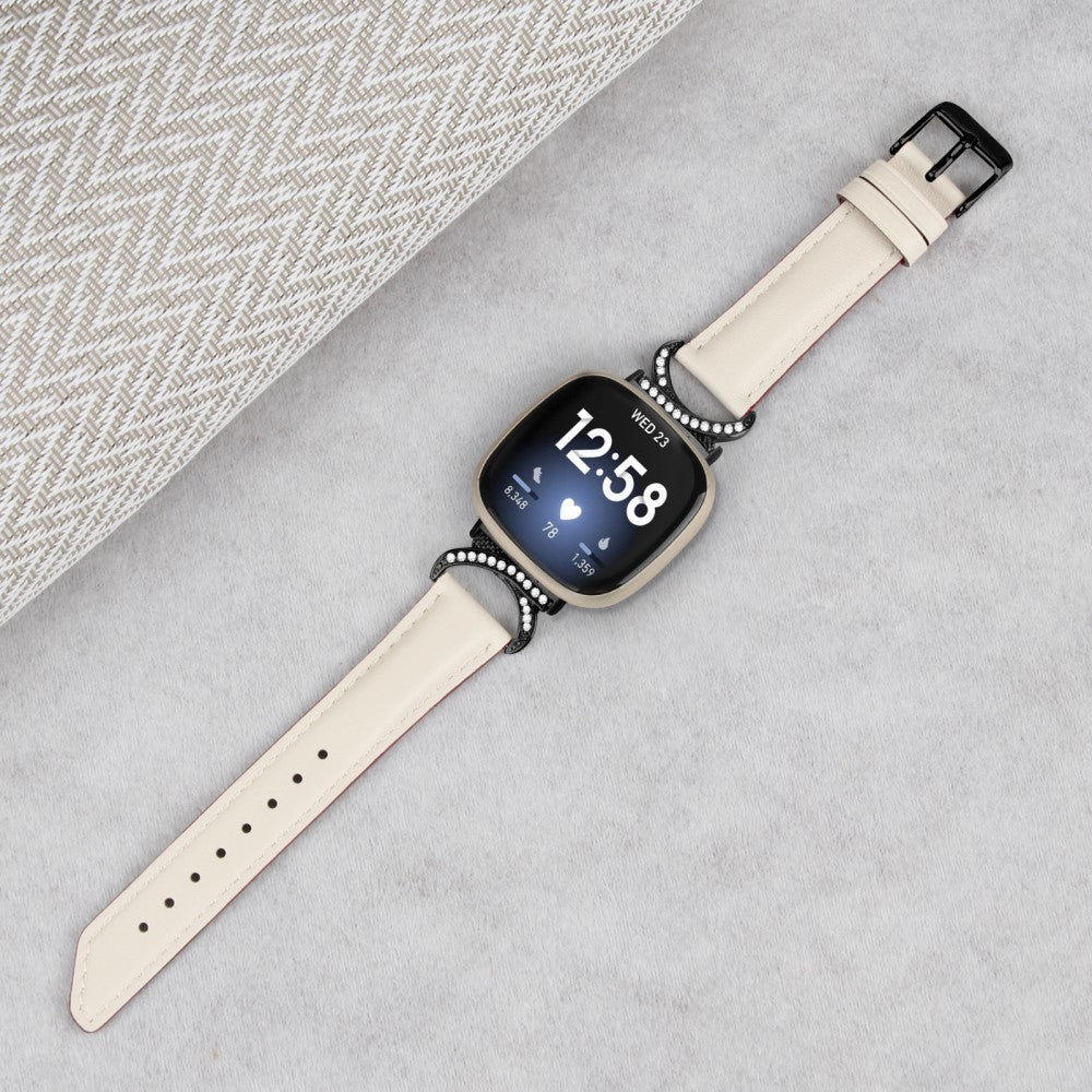 For Fitbit Versa 3 / Versa 4 / Sense / Sense 2 Split Leather Watch Strap Rhinestone D-shape Connector Wrist Band with Black Buckle - Apricot