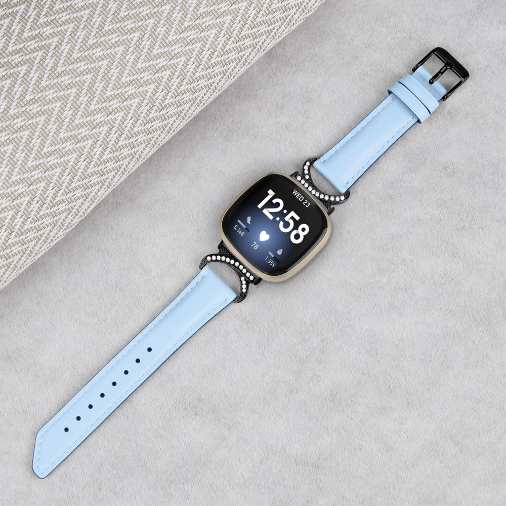 For Fitbit Versa 3 / Versa 4 / Sense / Sense 2 Split Leather Watch Strap Rhinestone D-shape Connector Wrist Band with Black Buckle - Blue