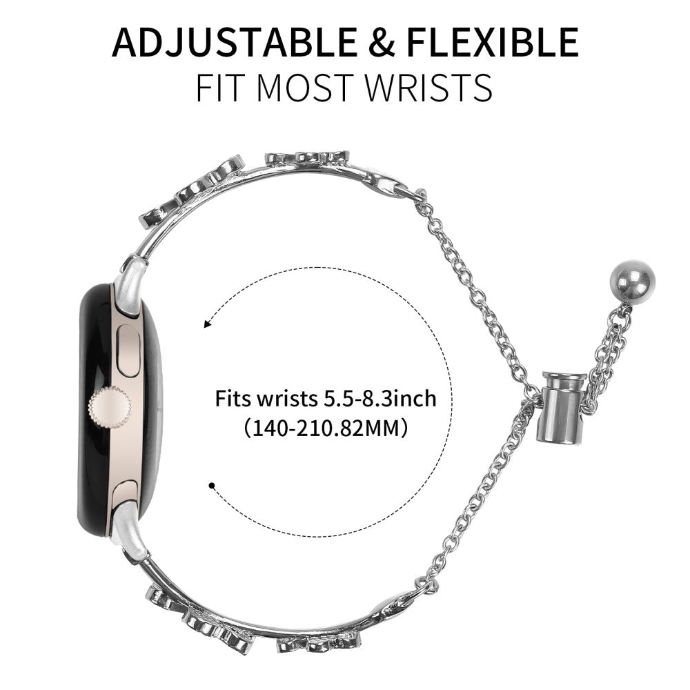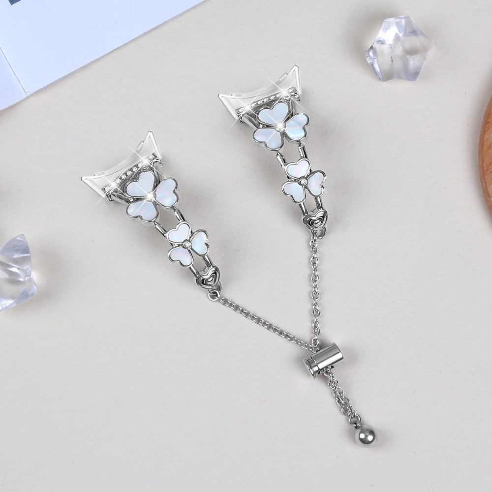 Elevate your style with this exquisite smartwatch band, meticulously crafted from a premium metal alloy that ensures both durability and elegance. The charming heart and clover motif seamlessly combines sophistication with wearability, making it a stunning accessory for any occasion. Its polished finish and fine workmanship provide a luxurious touch, allowing you to wear the bracelet comfortably throughout your day.Designed with an innovative push-button drawstring lock, this band allows for effortless adjustment, ensuring a snug and tailored fit without the need for any tools. Whether you’re dressing for a casual outing, attending a business meeting, or stepping out for a formal event, this bracelet complements your look flawlessly. Add a touch of grace to your wearable device and express your unique style with this beautiful blend of function and fashion.