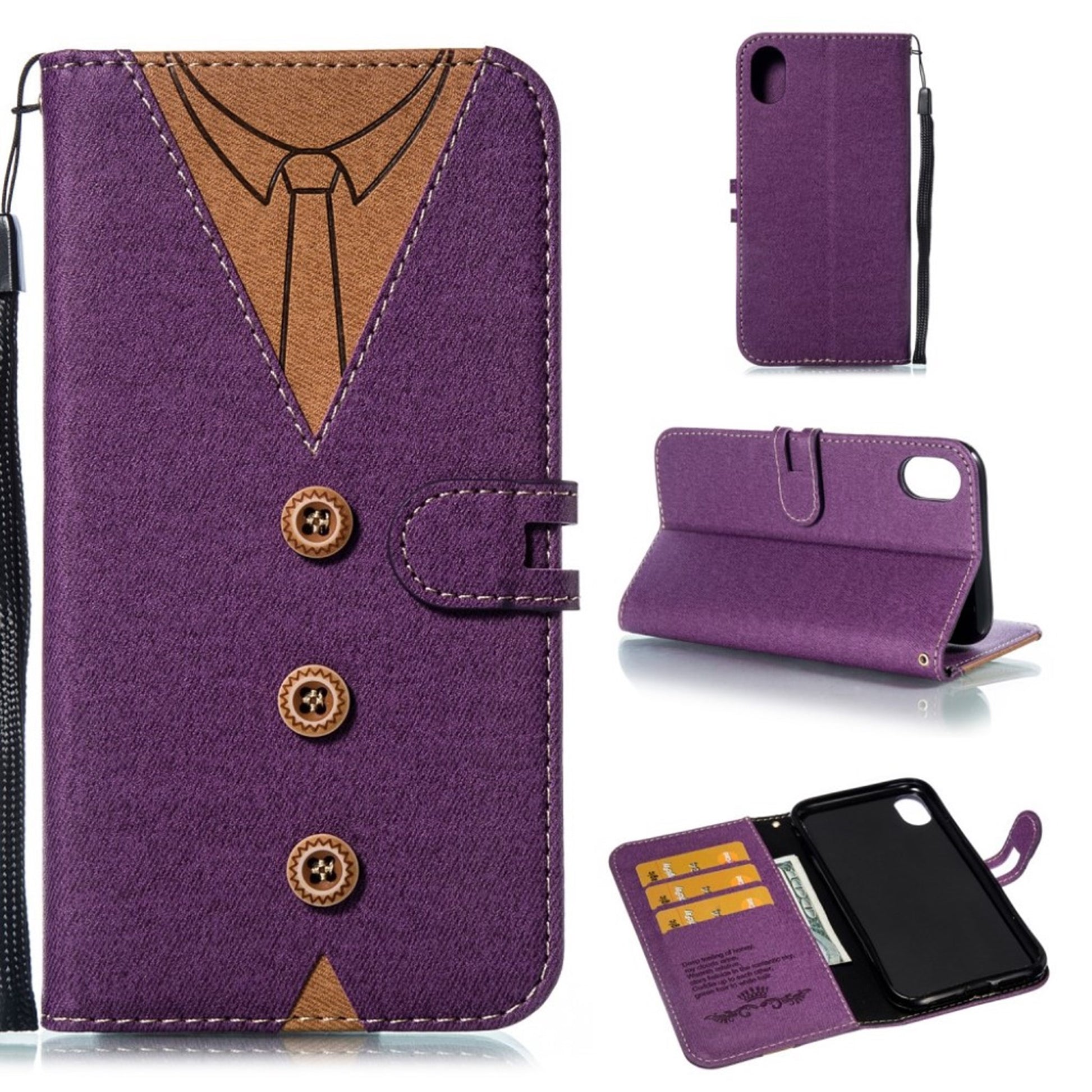 Splicing Imprint Men Tie Button Decor Leather Cover Protector with Strap for iPhone XR 6.1 inch - Purple