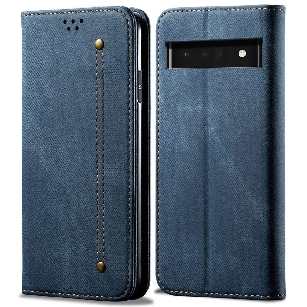 Retro style Google Pixel 6 Pro case made from denim textured cloth. The Jeans case for Google Pixel 6 Pro has two slots for credit cards and a pocket.