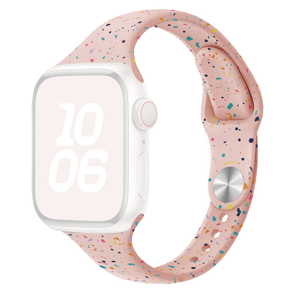 Experience unparalleled comfort and style with this watch band crafted from soft, skin-friendly silicone. Its lightweight construction ensures your wrist feels liberated throughout the day, whether you're pursuing an active lifestyle or simply enjoying everyday wear. The band boasts a striking design featuring vibrant flakes, adding a unique artistic flair that is sure to turn heads. Engineered for breathability, the hollow-out design promotes airflow, keeping your wrist cool during workouts or outdoor activities. This band integrates seamlessly with your watch, providing a secure fit that looks sleek and polished. The slim, waist-cinching silhouette not only offers a snug feel but also enhances your wrist's natural shape, making it an ideal accessory for any occasion. Elevate your potential with this stylish yet functional addition to your wardrobe.