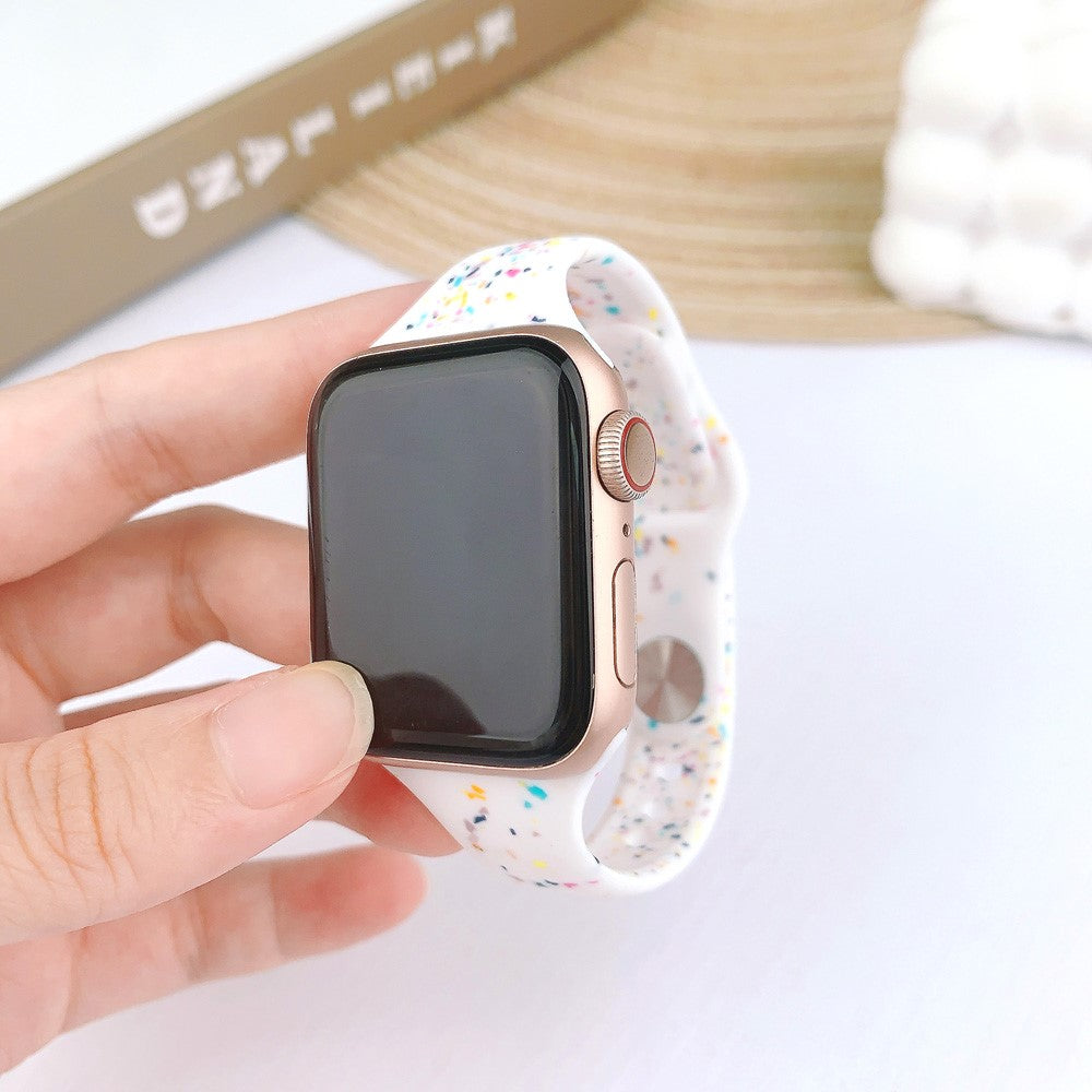 Experience unparalleled comfort and style with this watch band crafted from soft, skin-friendly silicone. Its lightweight construction ensures your wrist feels liberated throughout the day, whether you're pursuing an active lifestyle or simply enjoying everyday wear. The band boasts a striking design featuring vibrant flakes, adding a unique artistic flair that is sure to turn heads. Engineered for breathability, the hollow-out design promotes airflow, keeping your wrist cool during workouts or outdoor activities. This band integrates seamlessly with your watch, providing a secure fit that looks sleek and polished. The slim, waist-cinching silhouette not only offers a snug feel but also enhances your wrist's natural shape, making it an ideal accessory for any occasion. Elevate your potential with this stylish yet functional addition to your wardrobe.