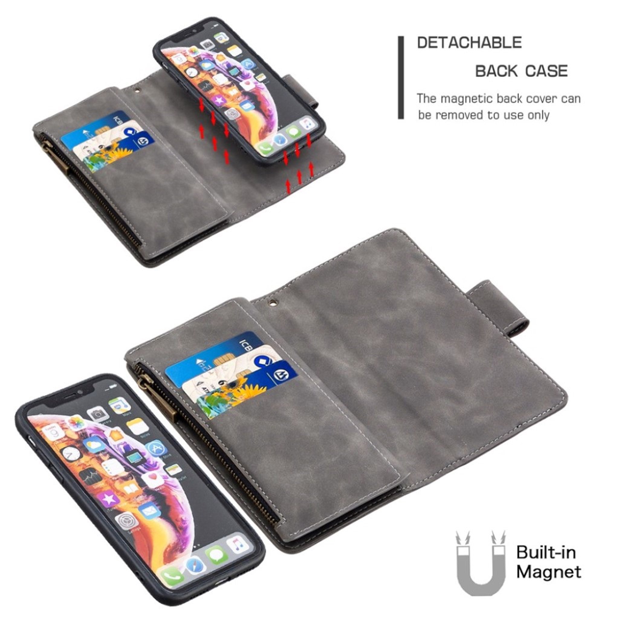 The Premium Wallet for iPhone Xr has a detachable magnetic phone cover that can be used seperately. The Premium Wallet features a large zipper pocket, multiple card slots and a strap. A perfect solution for keeping all your necessities in one place.