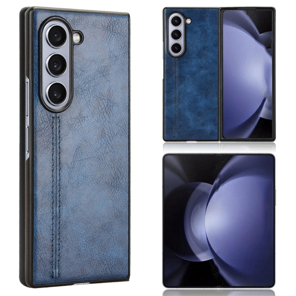 Samsung Galaxy Z Fold6 5G Case Cowhide Texture Leather and Bump Resistant Phone Cover Stitching Lines - Blue