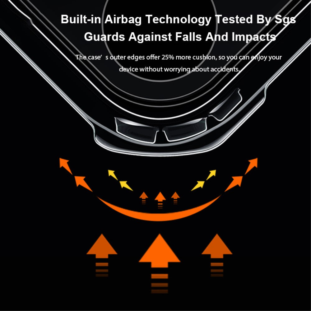 A stylish case made out of TPU and an acrylic material, making it lightweight, flexible and durable. It has a raised emboss around the camera, so that the lenses doesn't touch the surface when it's laying down. It has an airbag feature, meaning that air is trapped inside the case, to make it more drop resistant - as well as reinforced corners for the very same reason!
