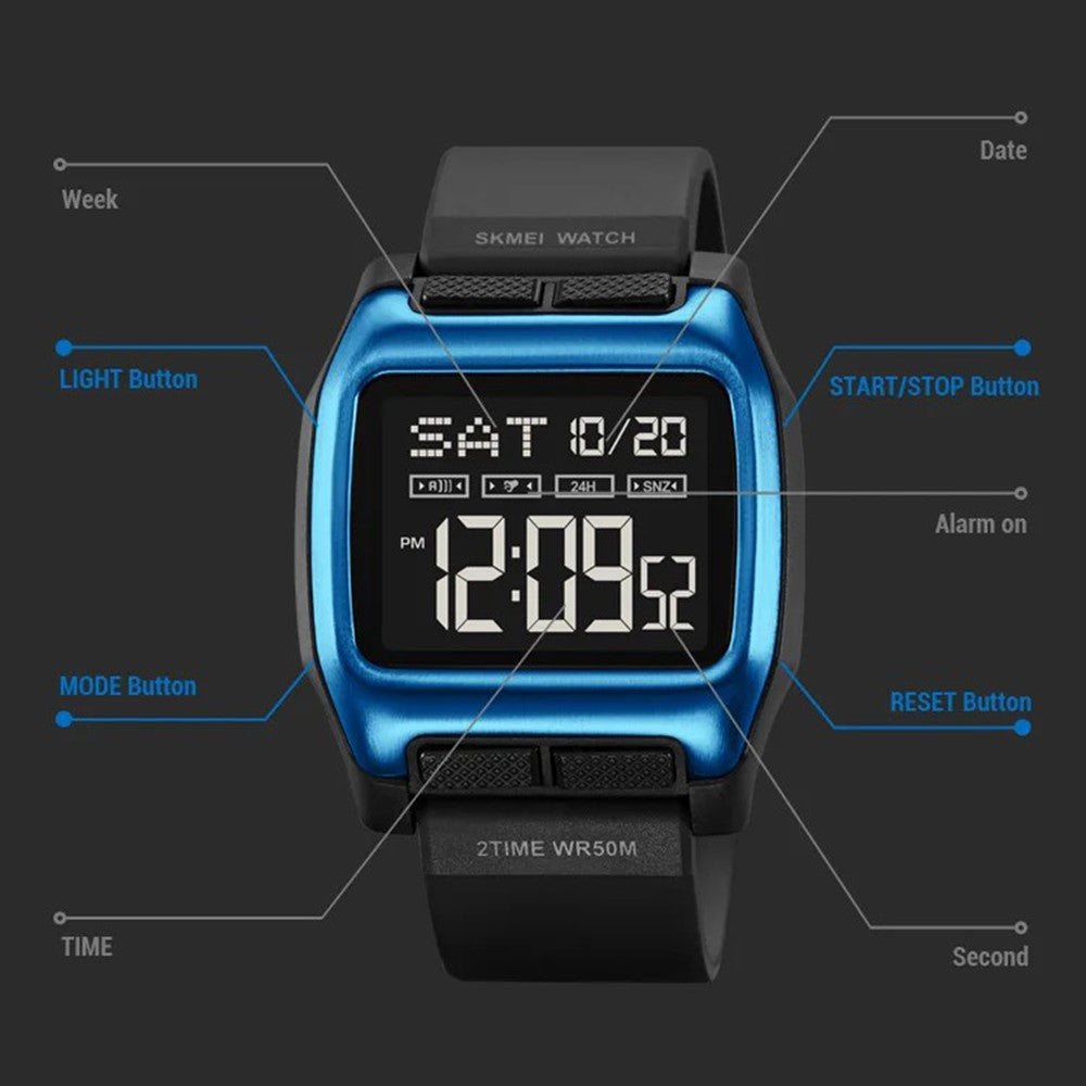 Stay effortlessly stylish with this square electronic watch, perfect for both students and business professionals. The soft, flexible strap is easy to adjust for a comfortable fit. Featuring an EL luminous function, telling time in the dark is a breeze. With a stopwatch, date display, day of the week display, and alarm clock function, this watch is as practical as it is convenient. The 50m daily waterproof function means you can wear it while swimming, washing your hands, or even in the rain. Stay on top of your schedule and look good doing it with this versatile and functional timepiece.