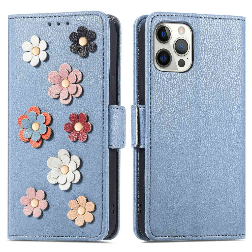 Soft flower decor leather case for iPhone 13 Pro - Blue