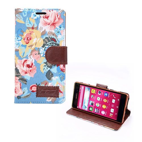 Sony Xperia Z3+ Leather Flip Case With Card Holder - Blue Flower Pattern