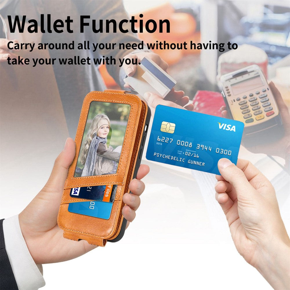 Are you tired of the regular, side-wallet kind of deal? Then this vertical one is perfect for you! Instead of opening it from the side, you open it top-to-bottom, 'flipping' it open like those cool old-school phones! Apart from the design, the benefits of this are that you get some extra storage in there, perfect if you're carrying a lot with you - especially with the zipper pouch on the front! It has a built-in magnetic sheet so that you can attach it to a magnetic car holder (sold separately).