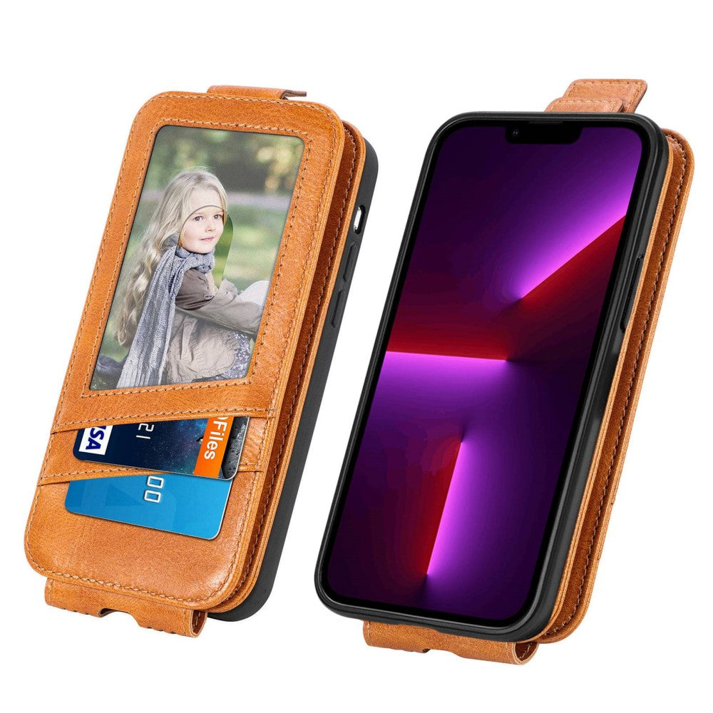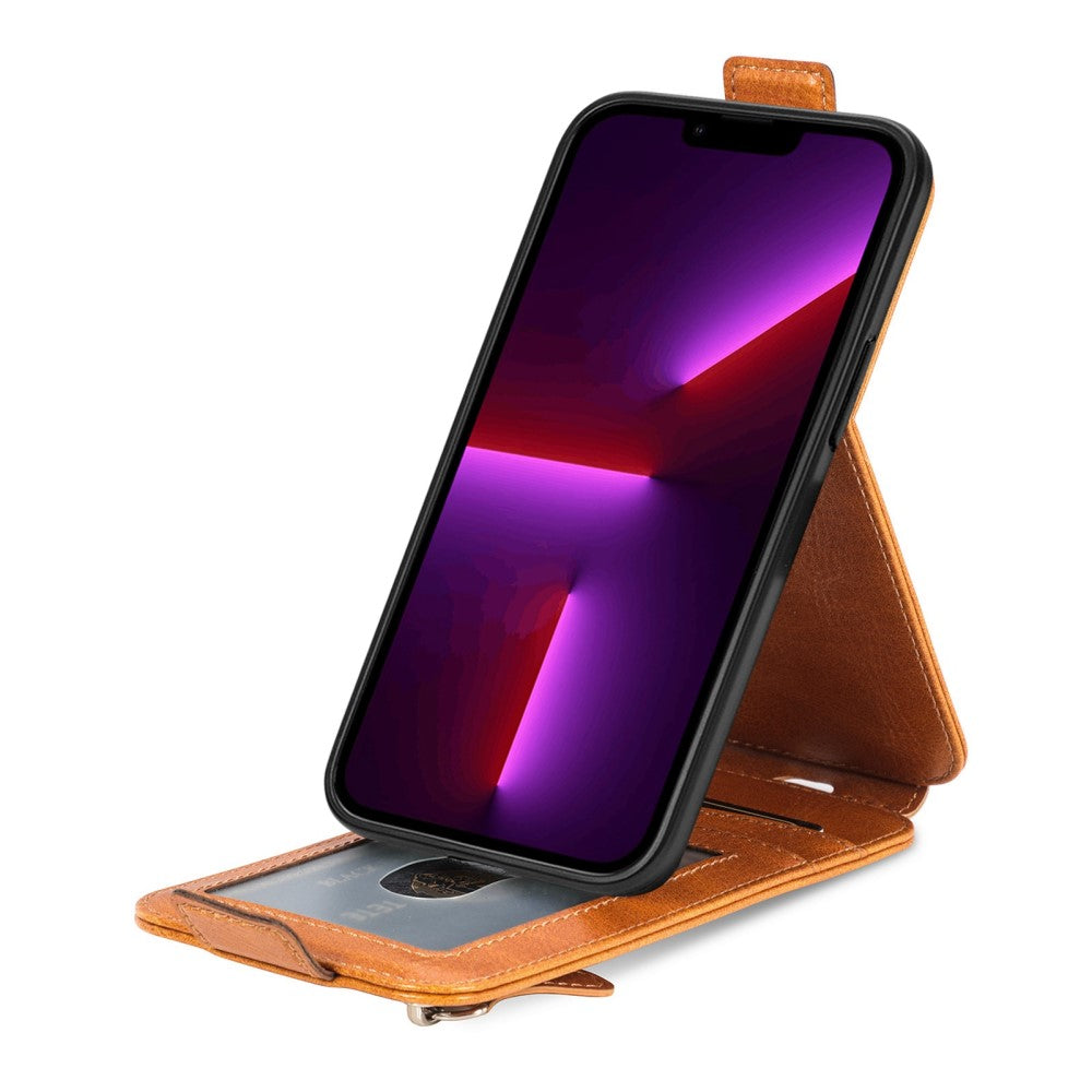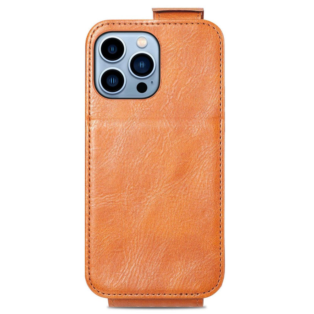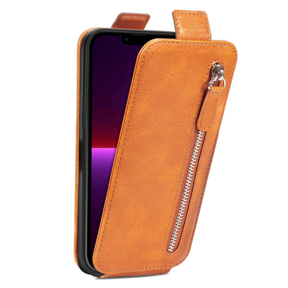 Vertical flip phone case with zipper for iPhone 13 Pro - Brown