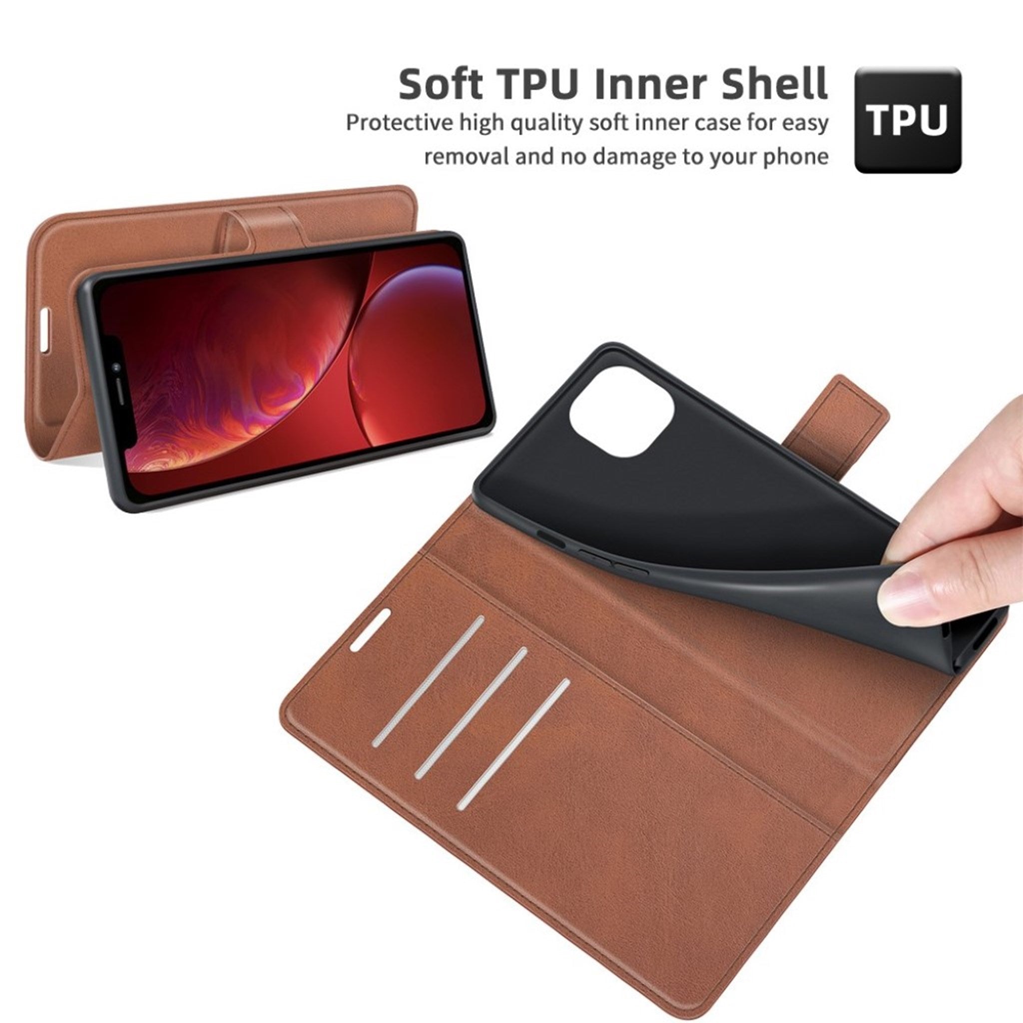 An easy to use wallet case for iPhone 13, perfect for those that wish to have something simple and functional for your phone. It has slots for 3 cards - and it's foldable, allowing the phone to stand on its own. The magnetic flap ensures the case keeps closed. Made out of durable TPU leather, for long-lived protection.