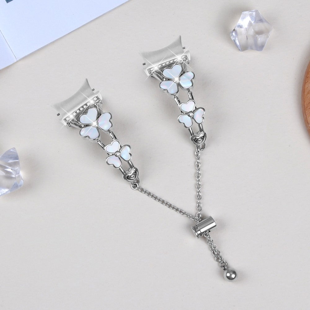 Elevate your smartwatch experience with this meticulously crafted band that seamlessly combines style and functionality. Featuring a professional connector, it ensures a secure and precise fit tailored specifically for your device. The premium metal alloy construction not only guarantees exceptional durability but also enhances your everyday aesthetics. Adorned with an elegant heart and clover motif, this bracelet effortlessly infuses sophistication into your wearable technology. Its finely polished surface and exquisite craftsmanship ensure a smooth and comfortable wear on your wrist, making it suitable for any occasion. The adjustable design includes a push-button drawstring lock, allowing for easy sizing adjustments without any tools, so you can achieve the perfect fit every time. Experience a harmonious blend of luxury and practicality with this beautiful smartwatch band.
