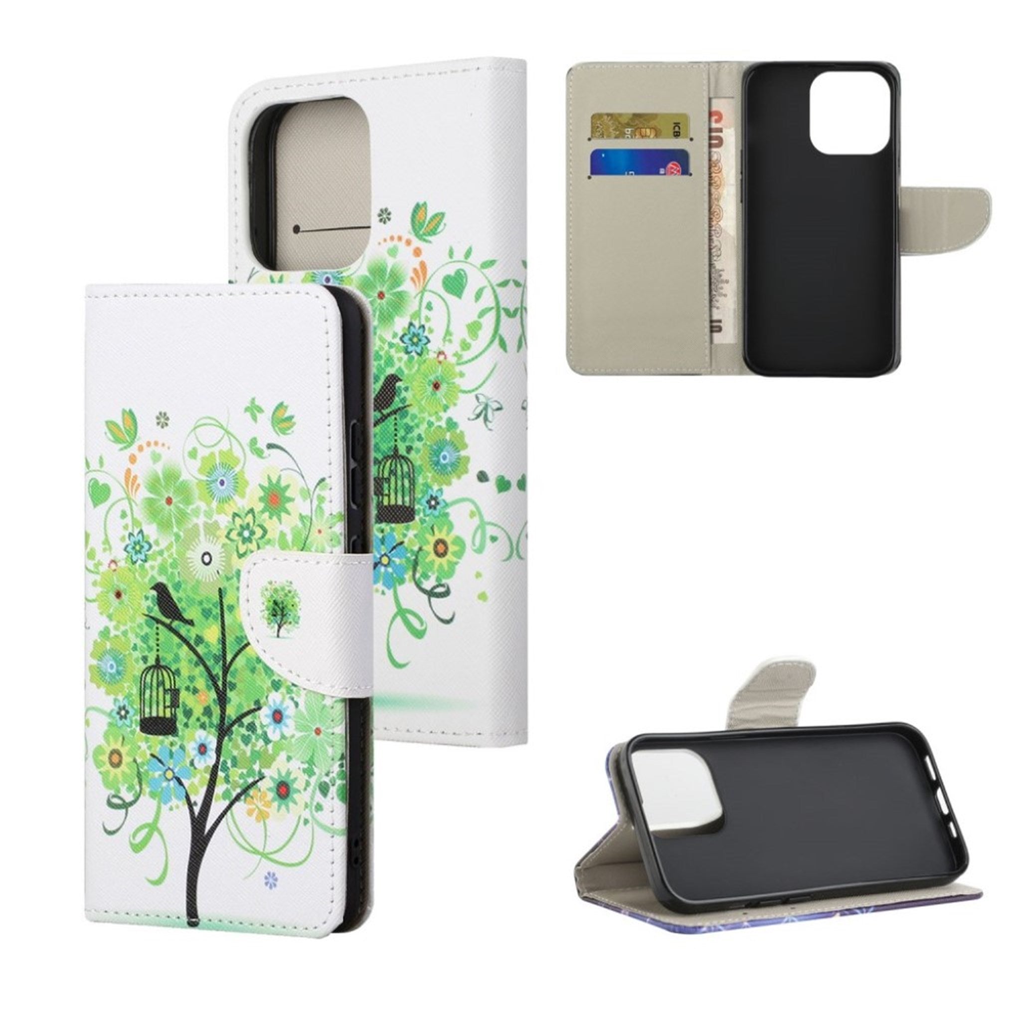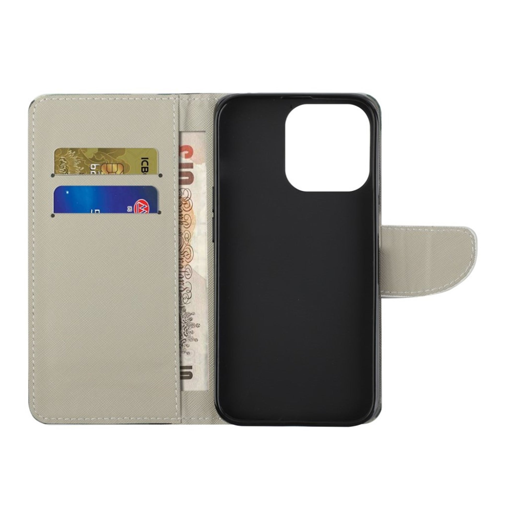 A iPhone 13 case with characteristic print made from durable imitation leather. The Wonderland case features two card slots and a pocket for cash notes. It has a magnetic clasp to keep the case closed and your iPhone 13 protected. The back can be folded to hold the mobile in an angled position for convenient viewing.