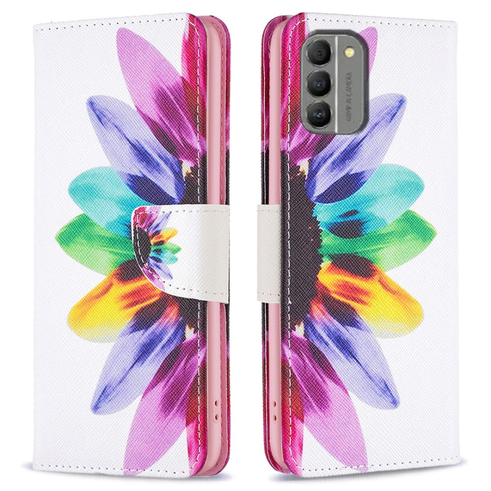 A Nokia G310 case with characteristic print made from durable imitation leather. The Wonderland case features two card slots and a pocket for cash notes. It has a magnetic clasp to keep the case closed and your Nokia G310 protected. The back can be folded to hold the mobile in an angled position for convenient viewing.